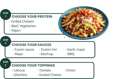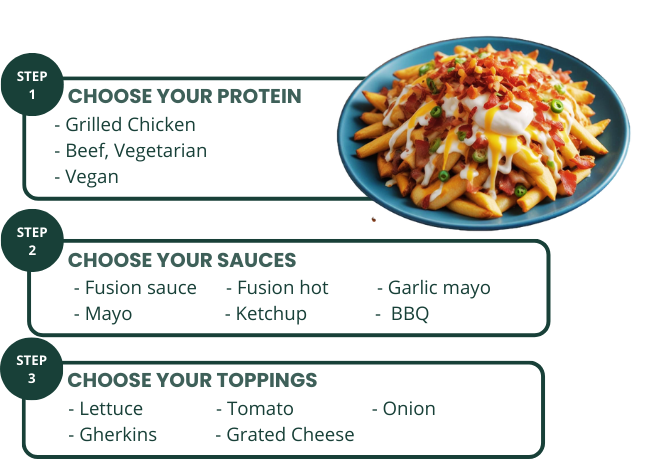 Elevate Your Fry Game: Our Loaded Fries are a canvas for your culinary creativity. Start with a crispy base and customize it with your choice of protein, from juicy grilled chicken to plant-based delights. Then, dive into a world of flavor with a variety of sauces, from tangy to spicy. Finally, top it off with fresh, crunchy toppings to create a one-of-a-kind fry experience.